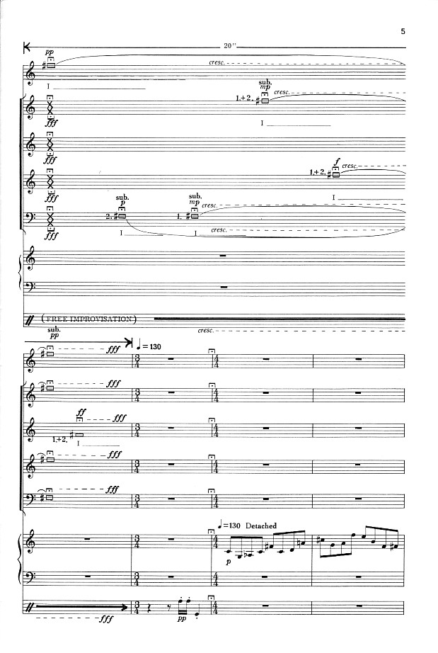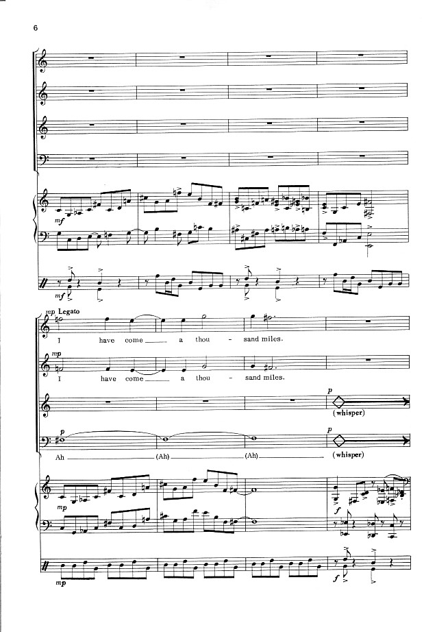 A dramatic choral expression.... somewhat avante-garde.... employs graphic notation, whispering, vocal glissandi, clusters, and a piano accompaniment that blends serialism and tonality with percussive ostinatos. This piece was the first place winner in the Mars Hill College Choral Festival and led to a publishing relationship with Hinshaw Music. "For Erwin Ruff and the University of Redlands Concert Choir" (1971/72) |