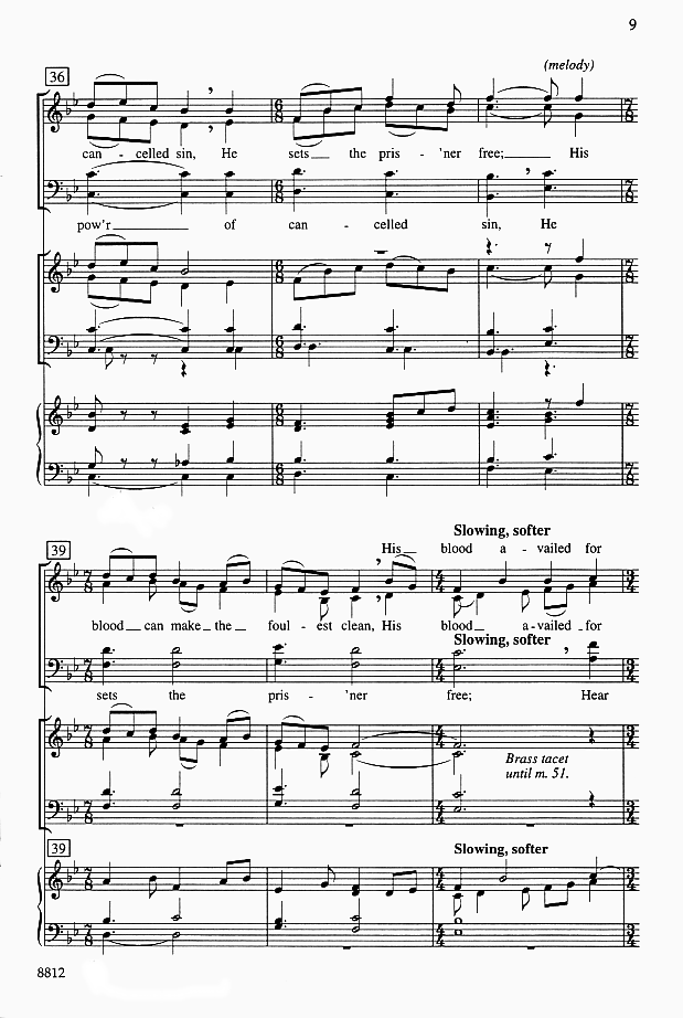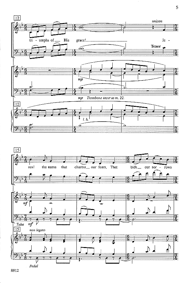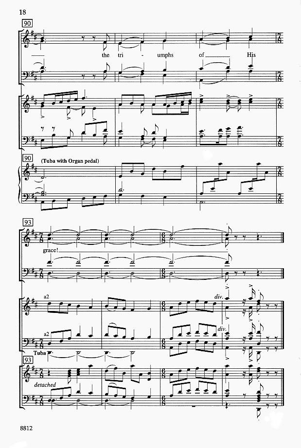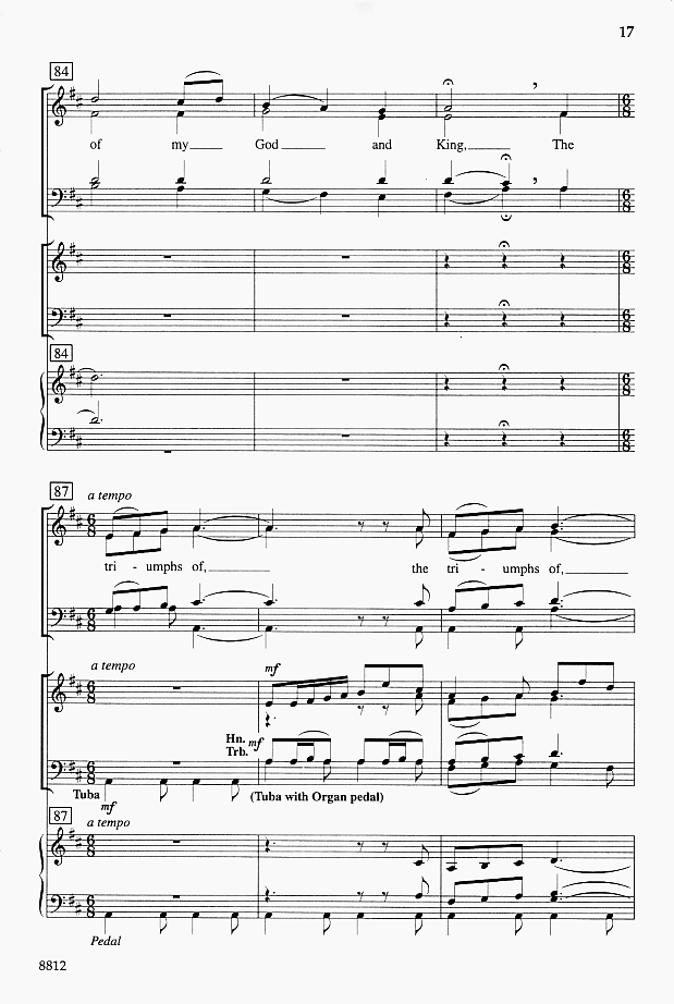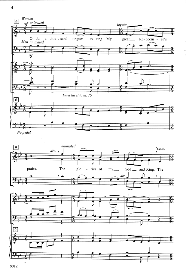 This vigorous anthem with optional Brass Quintet was commissioned for the 95th Anniversary of Castleview Baptist Church in Indianapolis, Indiana. The mixed meter employed throughout the music logically follows the natural rhythm of the words. The lilt created by these shifts in meter imparts a joyful buoyancy. Although challenging, this festive anthem is worth the effort! It concludes with powerful and idiomatic writing for the brass. Look for this new octavo and free CD now available.