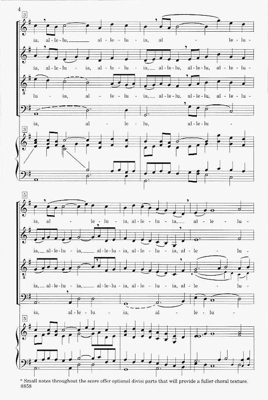 Bradley Nelson's choral transcription entitled "Alleluia" (1997) was conceived to correspond with Arnold Foster's orchestration (1938) of Ralph Vaughan Williams' "Rhosymedre - Prelude on a Welsh Hymn Tune" (1920) for organ. Arnold Foster's instrumentation uses strings alone (as in this recording), or can include any winds available from 2 flutes, 1 oboe, 2 clarinets, 2 bassoons, 2 horns, and trumpet. Choirs with instrumental resources may consider these additional options;