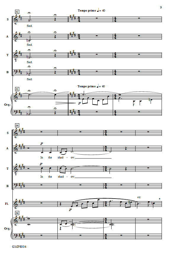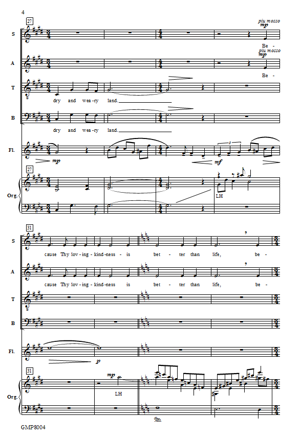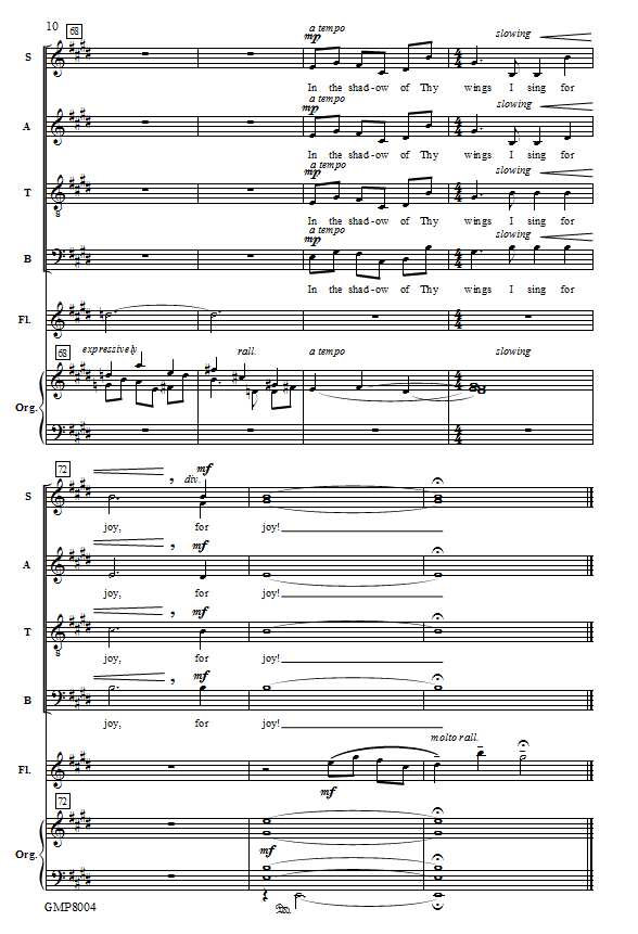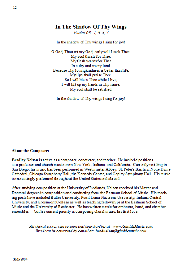 In The Shadow Of Thy Wings is a quiet and introspective setting of Psalm 63. The flute part and organ accompaniment gently frame this comforting portion of scripture. |