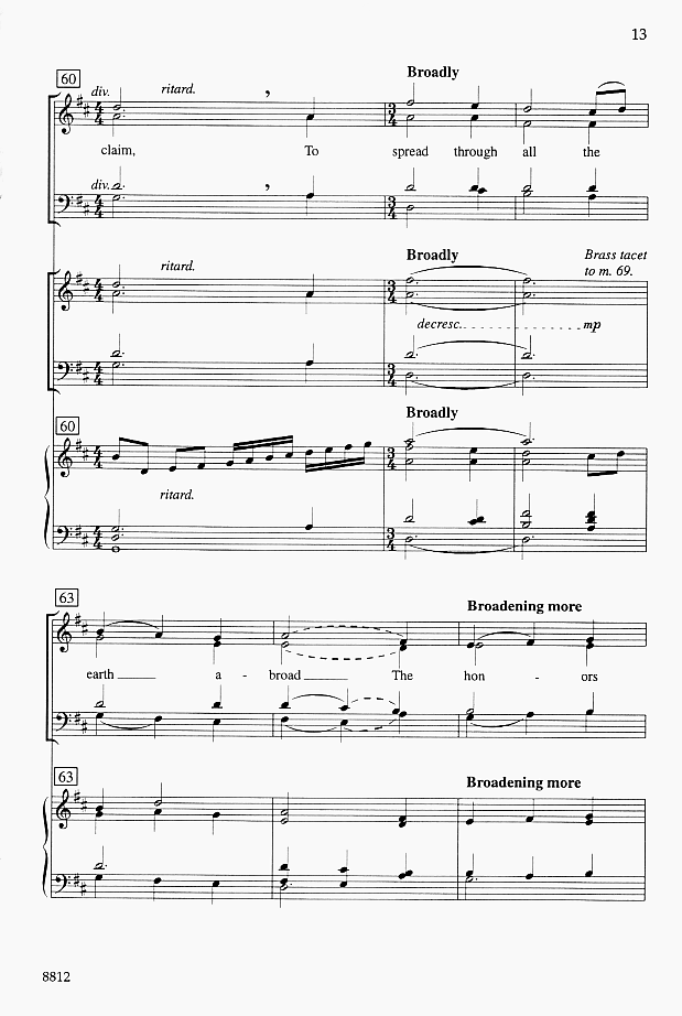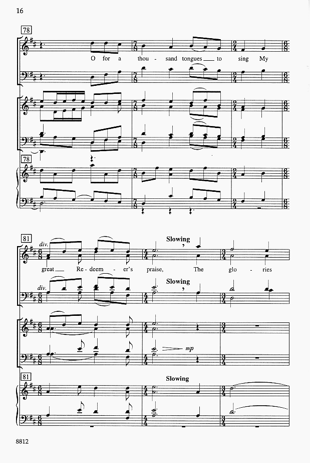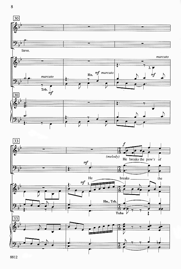 This vigorous anthem with optional Brass Quintet was commissioned for the 95th Anniversary of Castleview Baptist Church in Indianapolis, Indiana. The mixed meter employed throughout the music logically follows the natural rhythm of the words. The lilt created by these shifts in meter imparts a joyful buoyancy. Although challenging, this festive anthem is worth the effort! It concludes with powerful and idiomatic writing for the brass. Look for this new octavo and free CD now available.